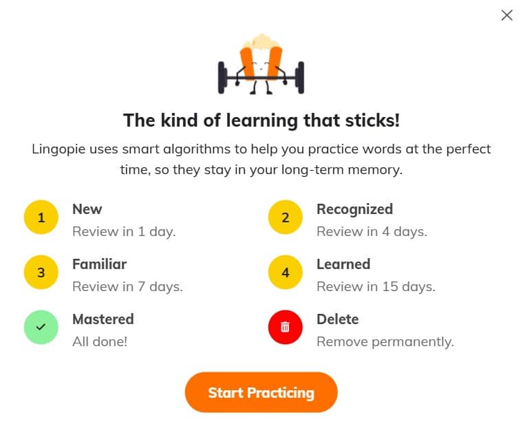 Lingopie also uses a strategy that tests your words at a certain pace, which will help with long-term memory.