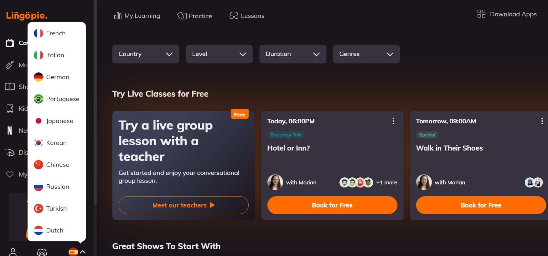 Lingopie is your one-stop shop to shows in your chosen language with tools to help you along the way. There are even Netflix shows from those countries in here for you to watch!