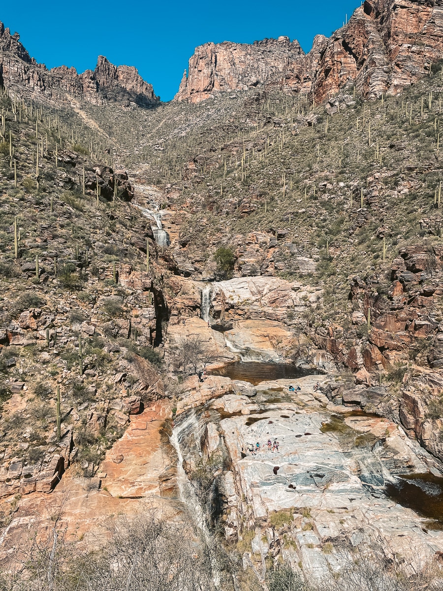 This hike takes you through the mountains, past a scenery of cacti, and finally to the culmination of multiple waterfalls in the middle of the desert.